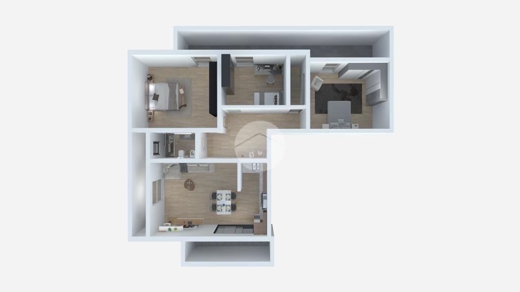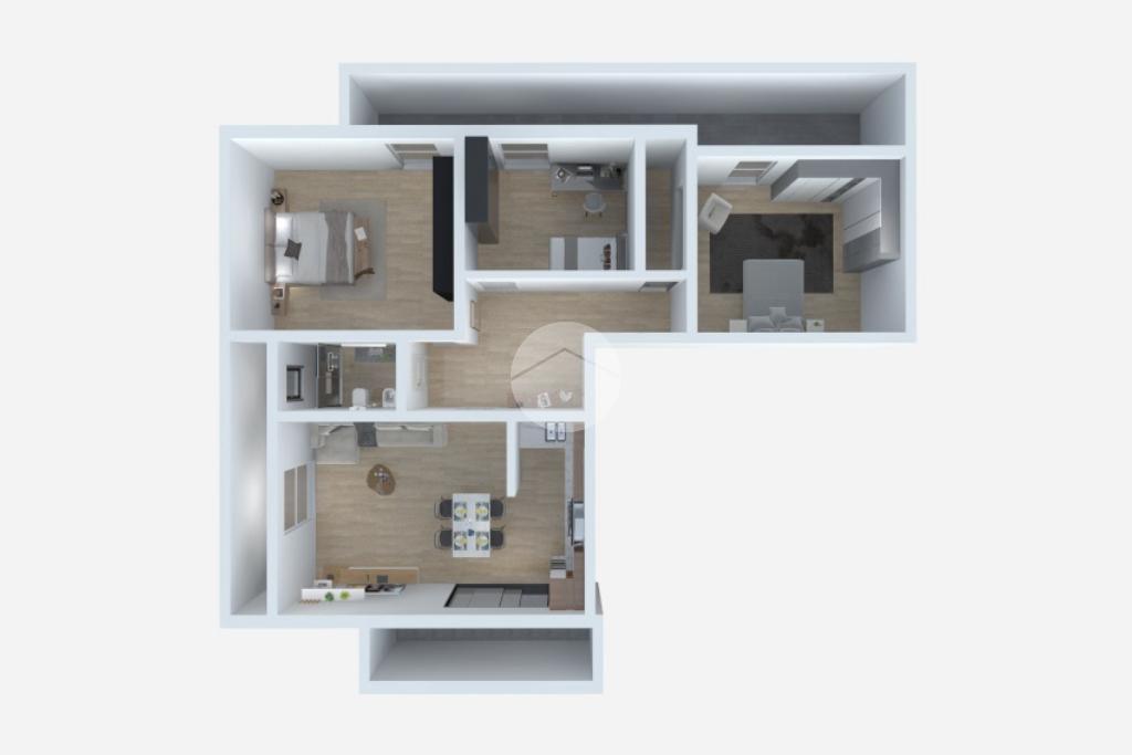 Ogni stanza dell'immobile ha accesso tramite portafinestra ad uno dei tre balconi con affacci nel verde.